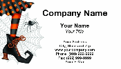 A whimsical business card for costume shops, Halloween retail, events or parties. Design includes orange and black witch leg with spider and web. |