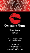 Red lips on black business card. Lacy damask pattern on top. |